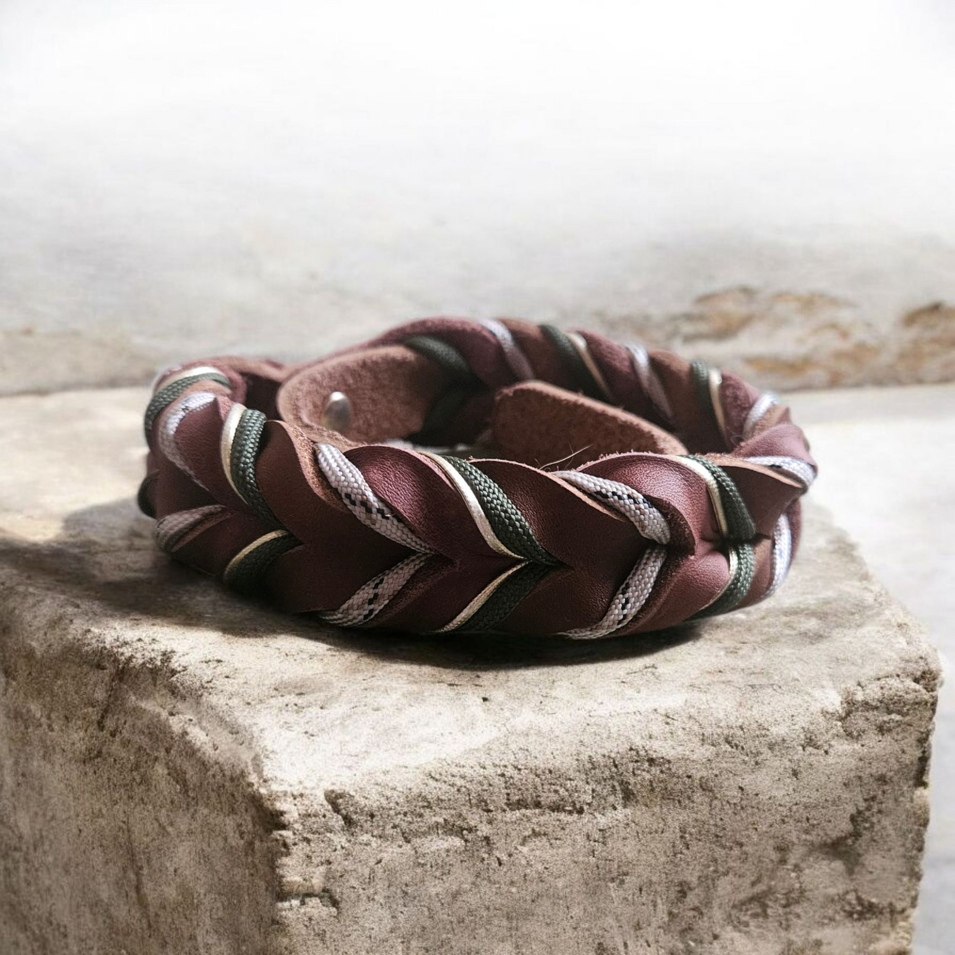 Le cœur du design réside dans un tressage raffiné composé de brins de paracorde aux teintes harmonieuses : vert olive, brun chocolat, beige et doré. Ces matériaux sont habilement entrelacés pour former une natte plate et régulière, offrant à la fois résistance et style. Les couleurs choisies créent un contraste délicat entre chaleur et douceur, idéal pour un look chic et original.
