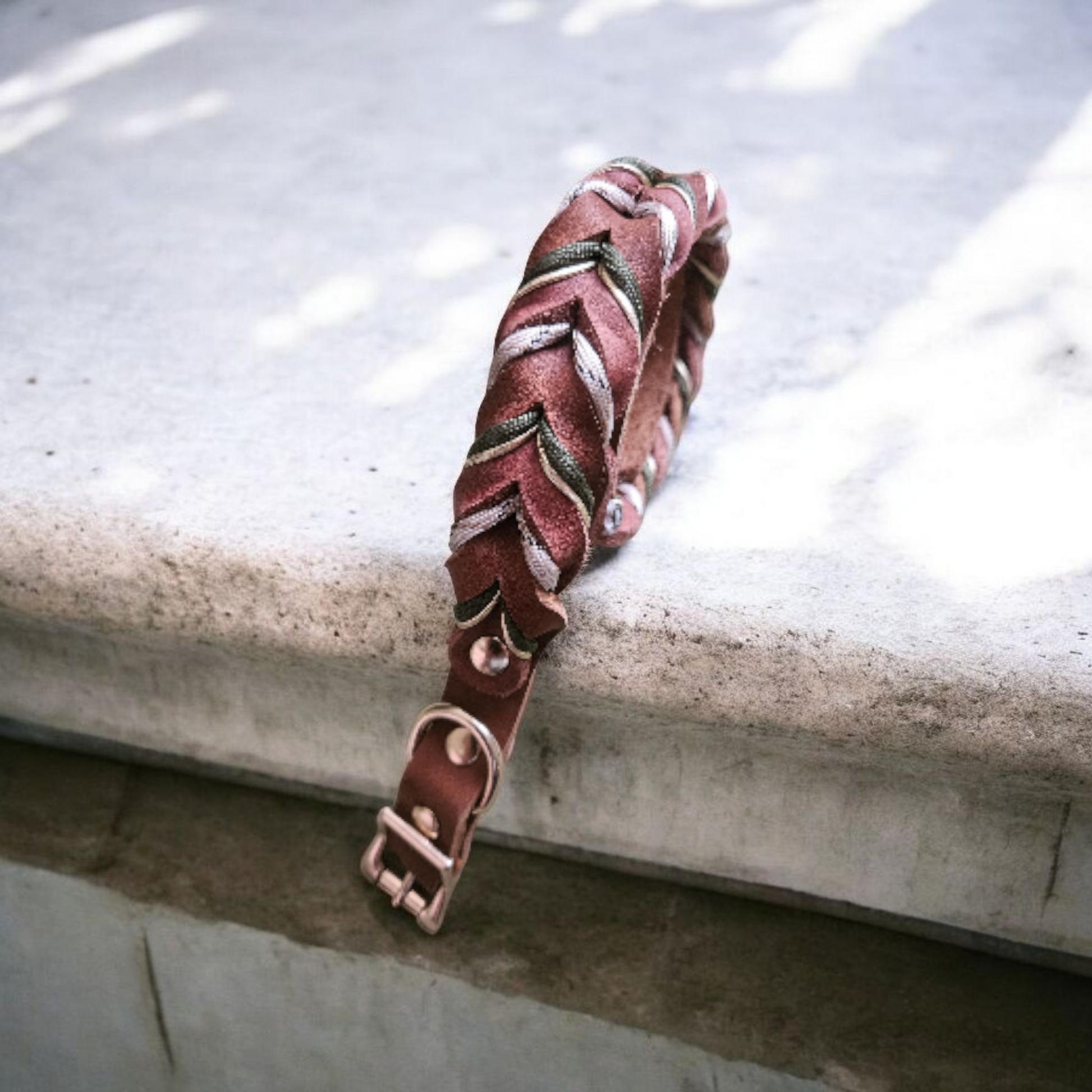 Ce collier pour chien allie élégance artisanale et robustesse, en mêlant subtilement cuir véritable et tressage en paracorde. Sa conception sophistiquée repose sur une base en cuir marron camel, épais et souple, assurant confort et durabilité pour un usage quotidien.