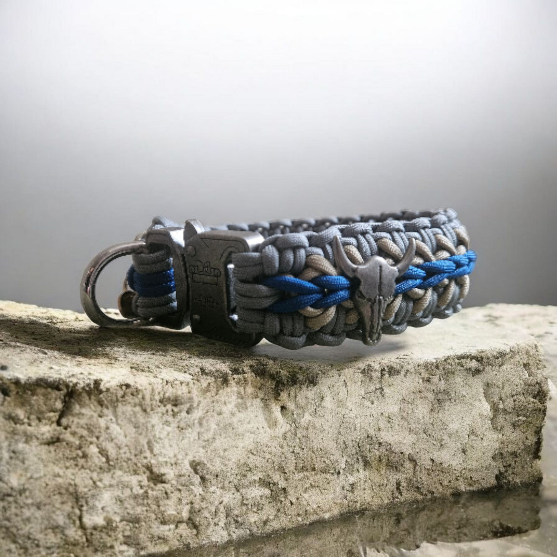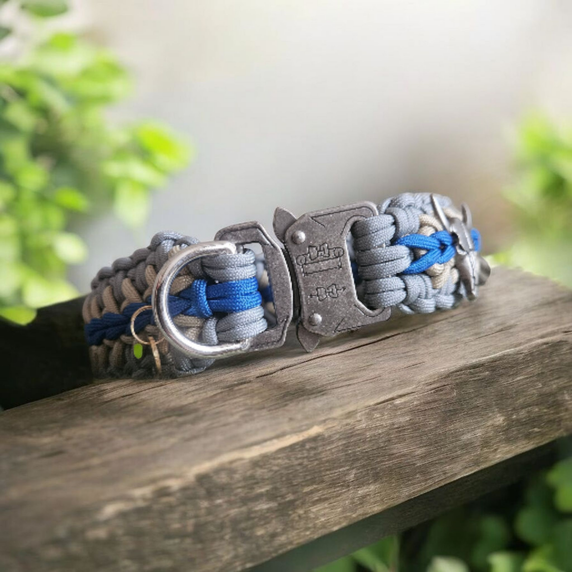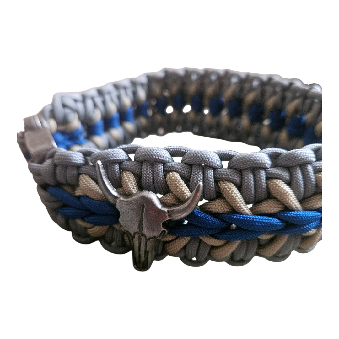 Ce collier pour chien tressé en paracorde se distingue par son style à la fois authentique et robuste. Les couleurs bleu, gris et beige de la corde, relevées d’une tresse centrale d’un bleu indigo profond, offrent un contraste élégant qui attire le regard. Au cœur de ce design, le tressage épais et serré du collier évoque un savoir-faire artisanal de grande qualité, donnant à l’accessoire une allure à la fois solide et travaillée.
