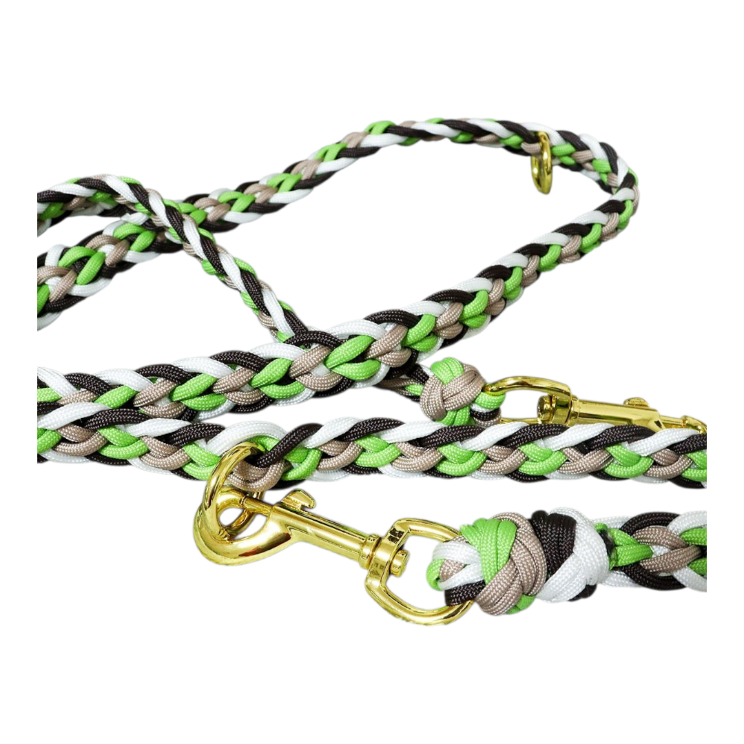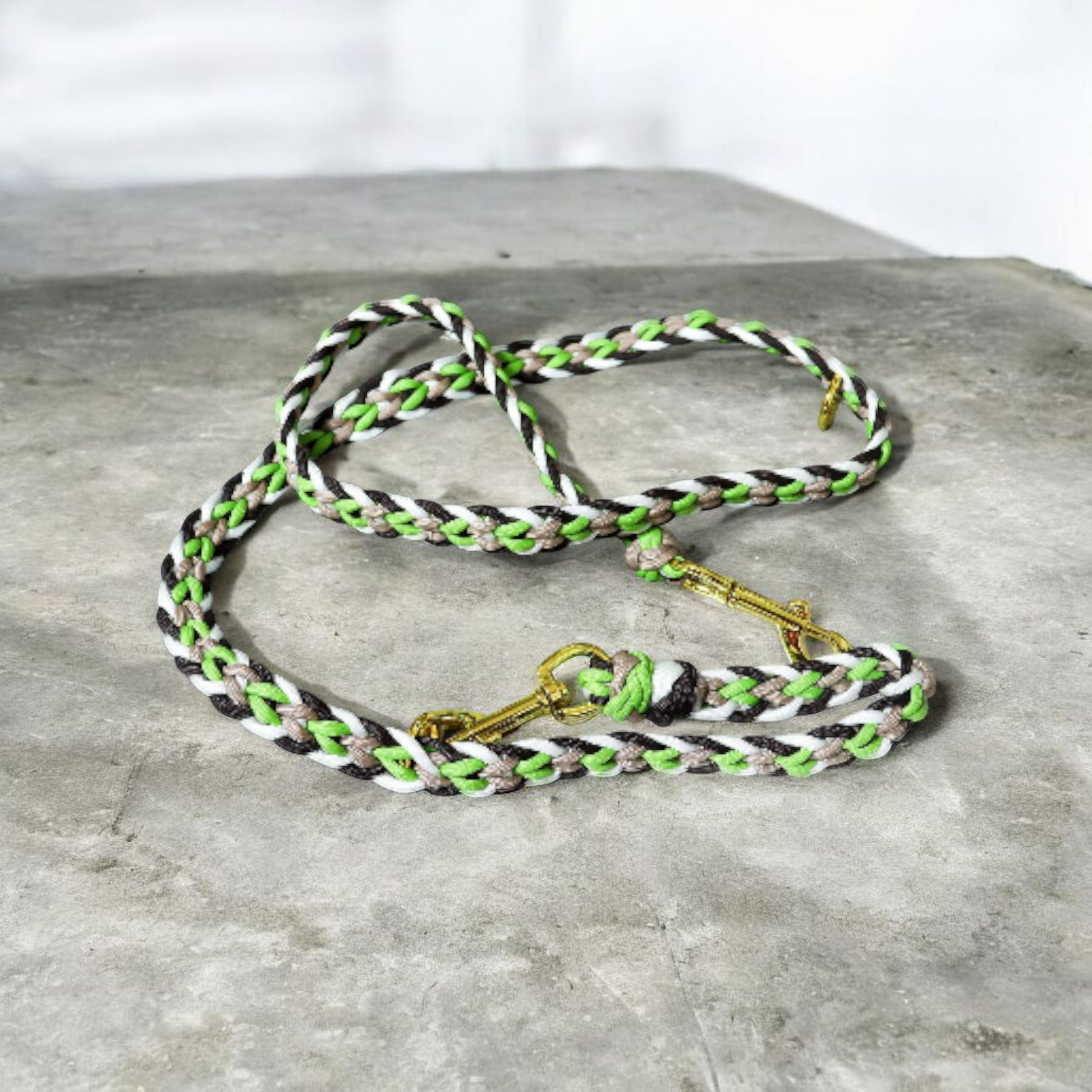 Cette laisse 3 points est fabriquée à la main en paracorde tressée, un matériau réputé pour sa solidité exceptionnelle et sa durabilité. Ses tons harmonieux de vert, blanc, noir et gris lui donnent un look naturel et original, parfait pour les balades en plein air.